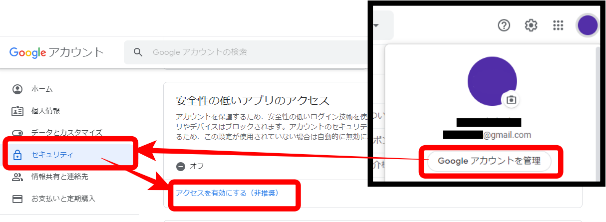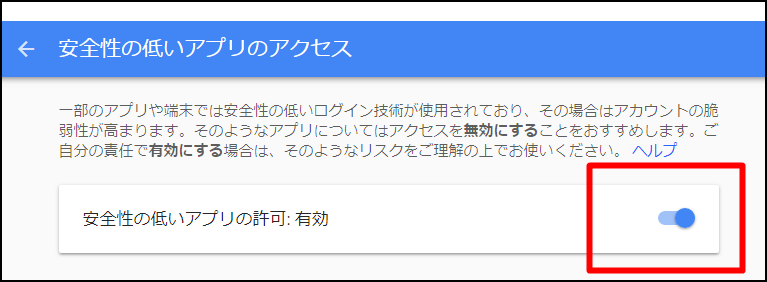 安全性の低いアプリの許可を有効に設定してください。
