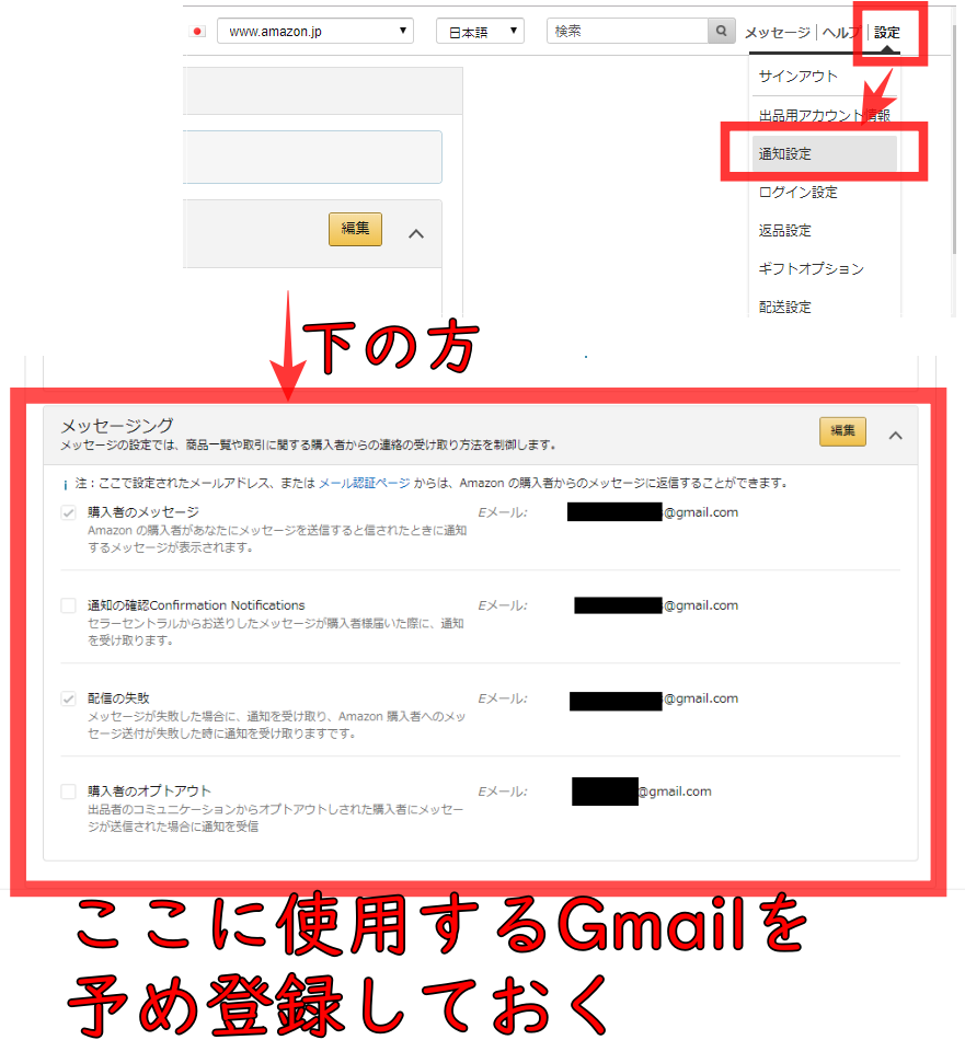 なお、使用するGmailアドレスは予めセラーセントラルに登録しておいてください。