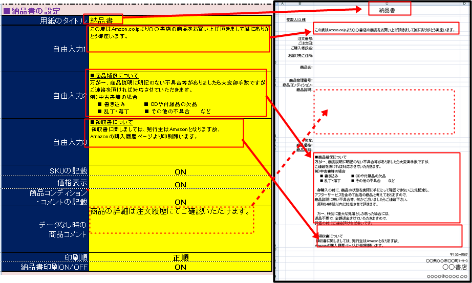 自由に入力して頂く項目の、印刷位置は上記のように対応しています。