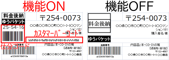 ONにすると以下のように仕分コードとカスタマーバーコードが表示されます。