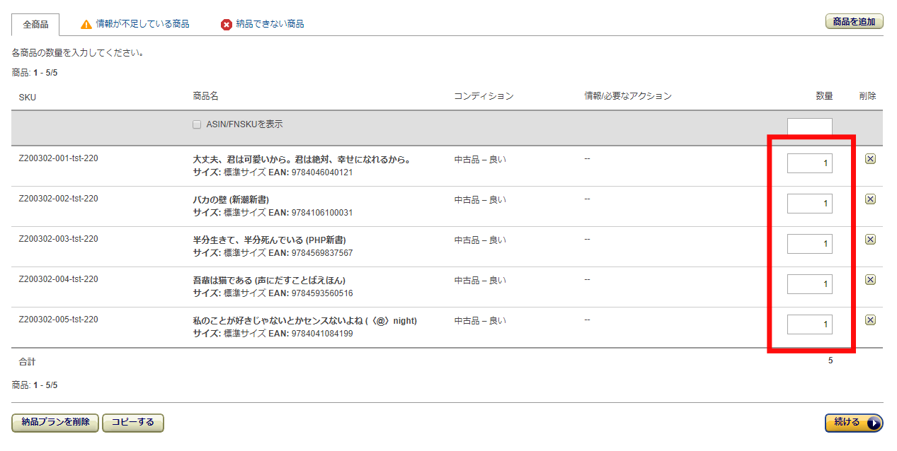 なお、出品データ作成時に入力してある数量を入れてプランが作成されているので