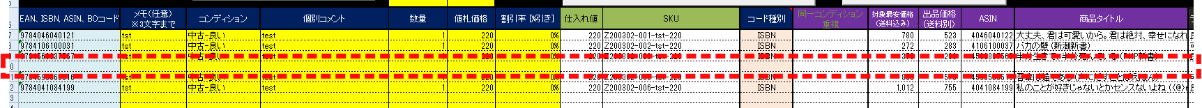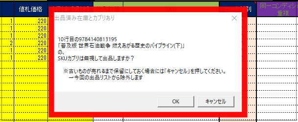 「キャンセル」の場合には、今回の出品リストからは除外します(該当行のデータを削除します)