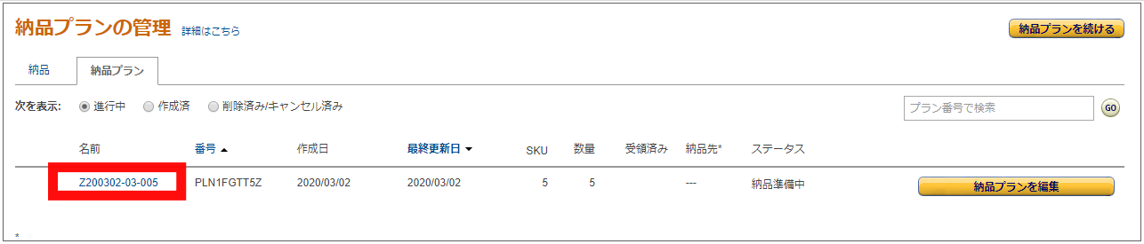 セラーセントラルの、在庫→FBA納品手続き→納品プラン