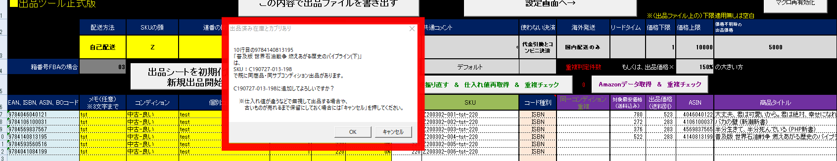 「OK」を押せば無視して今回振ったSKUで出品データが作られます。